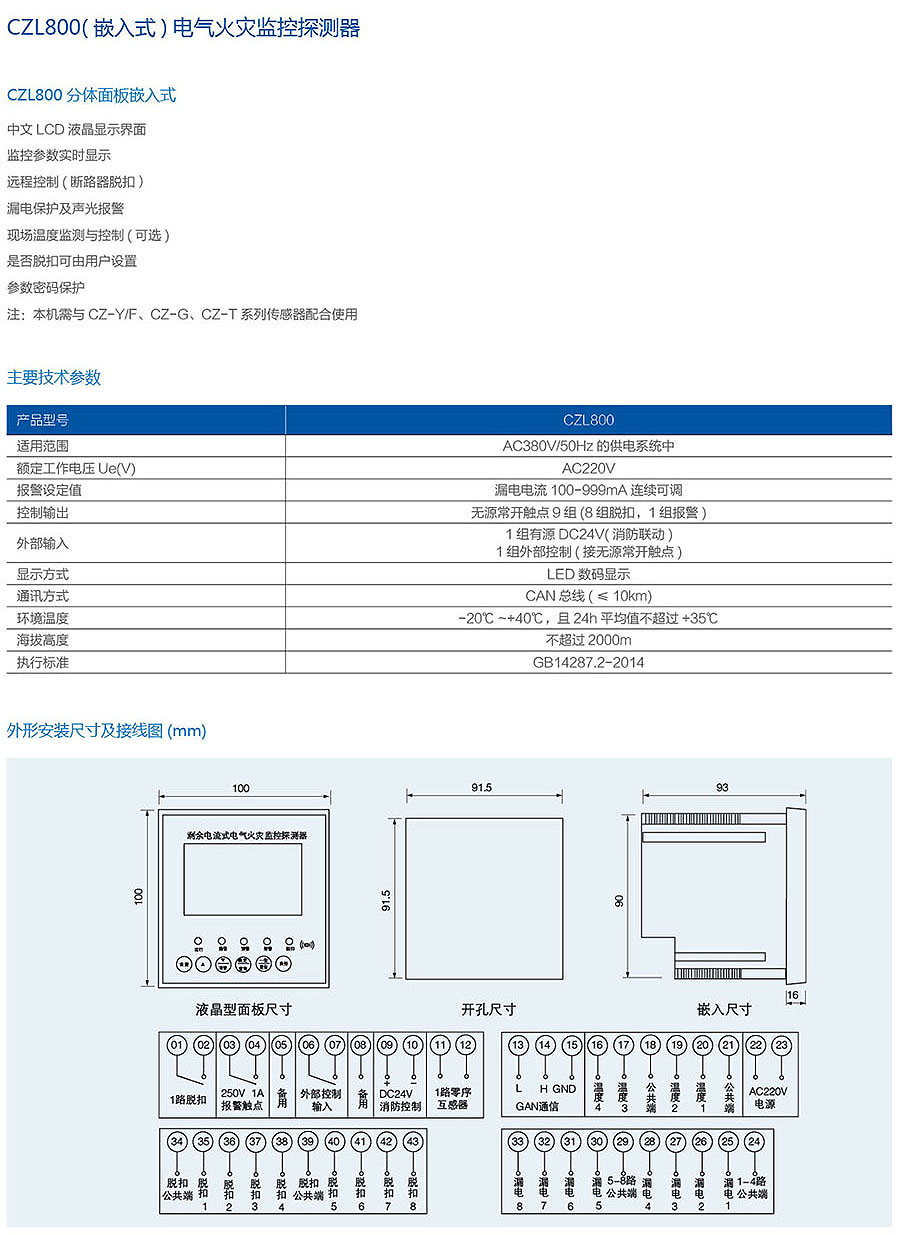 CZL800(嵌入式)电气火灾监控探测器
